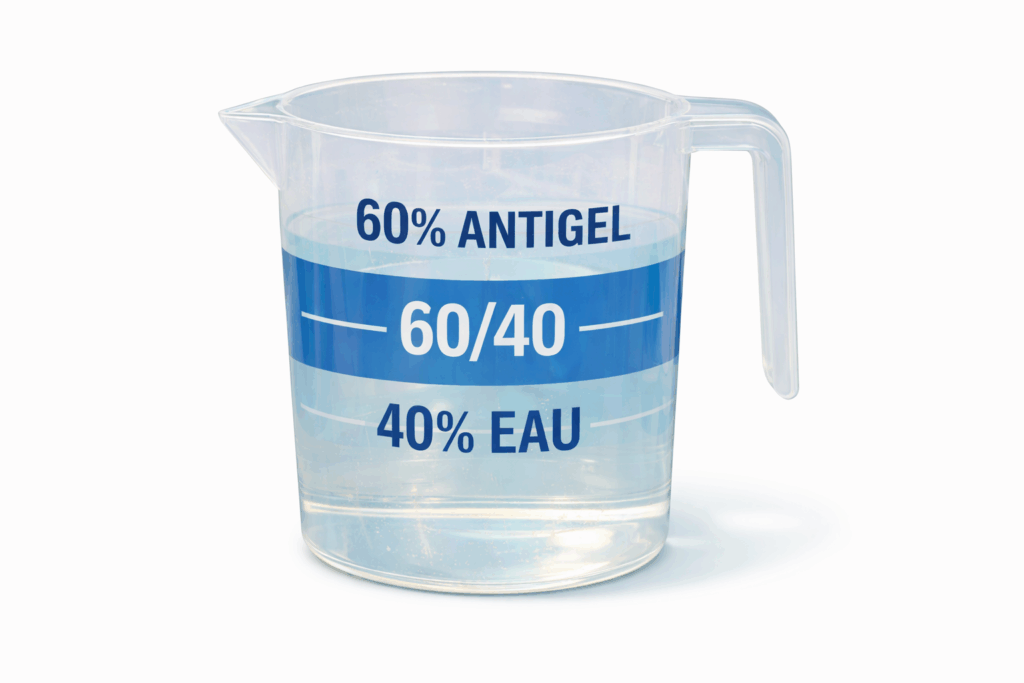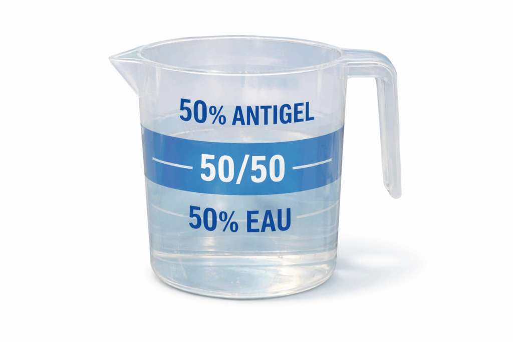 • 60 % d’antigel + 40 % d’eau pour une protection jusqu’à –23 °C